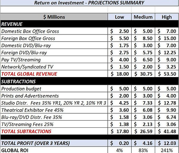 The Company seeks capitalization of $5 million to cover the production budget of God’s Glass, with the goal of earning $4.16 million over the three-year life of the film. The profit scenarios below (Low, Medium, and High) are based on a moderate result. Conversely, production costs are considered to be on the high side to avoid any possibility of financial shortfall.